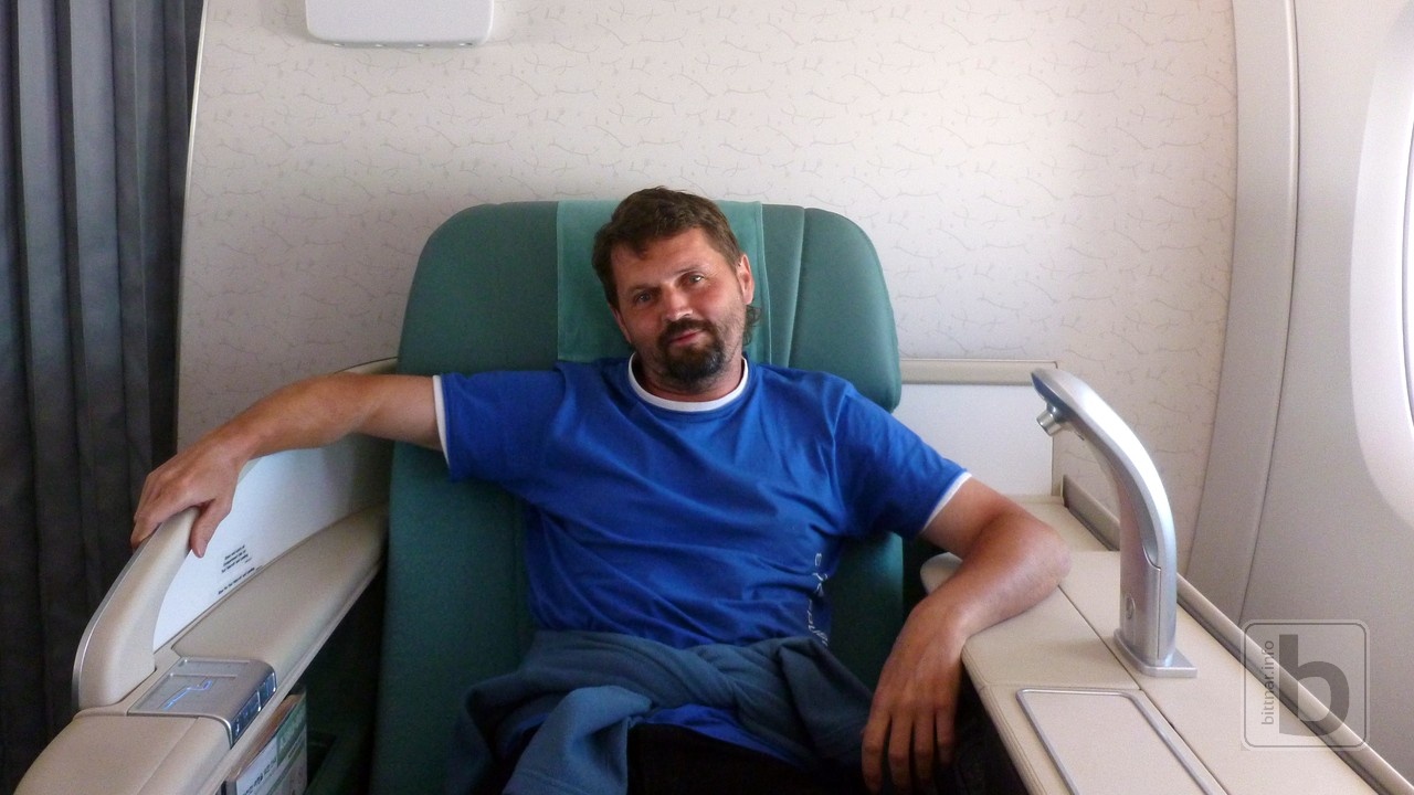 A takto běžně létáme - 1. třída v A380, sedačko-postel, vše ovládané elektricky, kůže (tedy asi koženka), LCD monitor odhadem 19", místa dostatek :) Podezřívám Evu, že už v Soulu při boardningu věděla, že First Class nás nemine :)