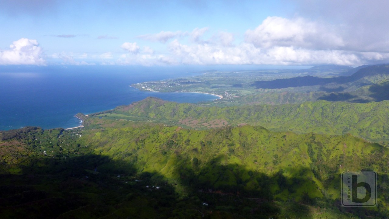 Pohled na severní část ostrova a zátoku Hanalei Bay naznačuje, že více než polovinu letu máme za sebou.