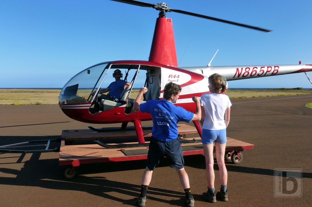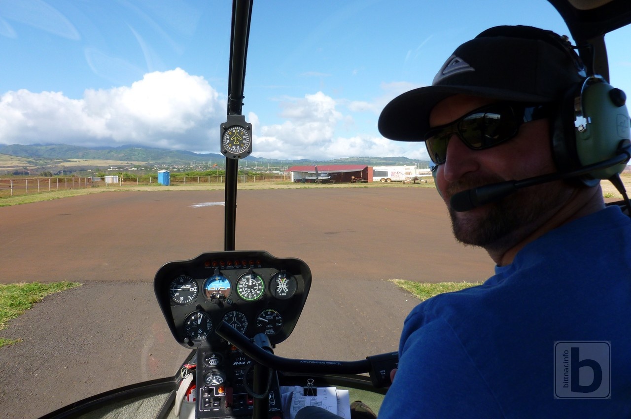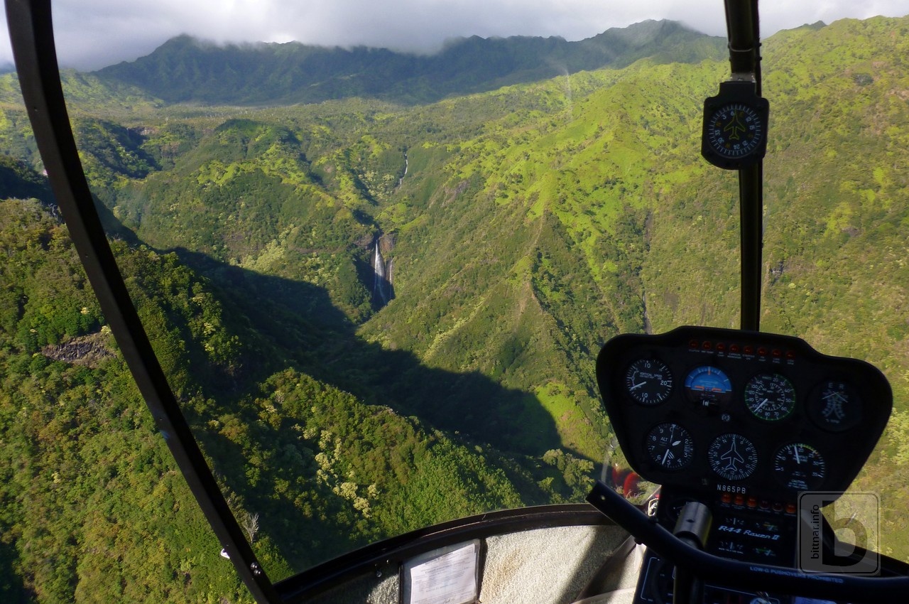 Vidíme 800 m vysoký vodopád, a další a další vodopády. Občas pilot komunikuje a koordinuje let s ostatními piloty. Jak je trochu lepší počasí, tak se počet vrtulníků na obloze zněkolikanásobí. To ostatně víme, když jsme šli Kalalau trail.