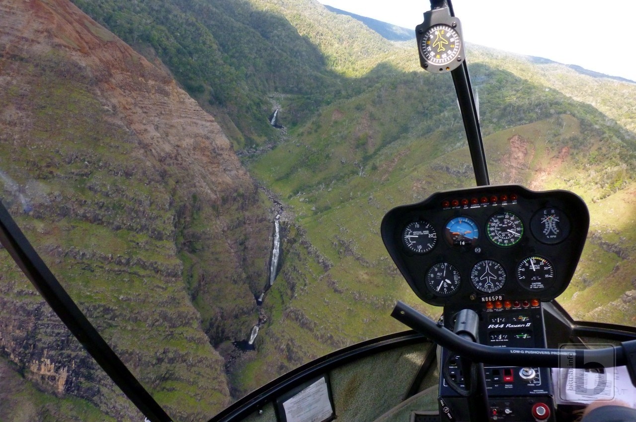 U tohoto vodopádu znovu vznáším dotaz na Jurský park. Viděl jsem ho před mnoha lety (narozdíl od Pirátů), tak si defacto už pamatuji pouze to, že tím film začíná. Ale on to ještě není. Každopádně ukazuje rukou nad nás, kde přelétá "écéčko" (Eurocopter EC-130), se slovy "too high and fast" (příliš vysoko a rychle). S tím nezbývá, než souhlasit. Výběr společnosti Inter-Island Helicopters byl správný, pominu rozšvihané MD500, které se objeví po vyhledání v google - Eva nemusí vědět vše..