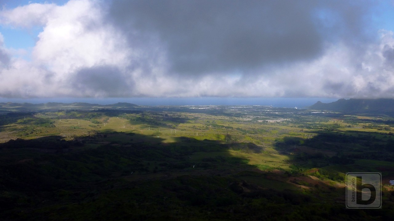 Hra světla a stínů při pohledu na západní pobřeží, vzadu hlavní město Lihue a hory oddělující západ a jih ostrova. Předchozích asi 5 min letu jsem slíbil, že nebude publikováno.. Že bychom přistáli to ne, ale špatné to nebylo.