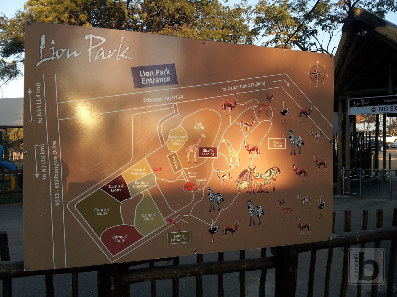 Park je rozdělen na několik částí (výběhů). V největší jsou zebry, žirafy a podobně. Dále čtyři pro lvy a lvice, další obývají gepardi a poslední divocí psi. Poměrně úsměvné je, že ranger u vjezdu ke lvům dává každému (autu) do ruky červený lístek s varováním, že okna mají zůstat po celou dobu zavřená.